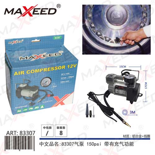 Item No:83307 Product name:83307 air pump (DC 12V, 30 cylinder, 150psi air compressor with inflation function, air flow rate: 30 liters/minute, 3-meter wire with cigarette lighter, 0.8M air hose, with three accessories) Color |