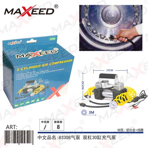 Item No:83308 Product name:83308 air pump (double bar 30 cylinder inflation pump (with light, battery, and cigarette lighter dual power) DC 12V, 150PSI, air flow rate: 70 liters/minute, 3 meters of wire, 0.8 meters of air hose+2.5 meters of PU yellow tube) Color |