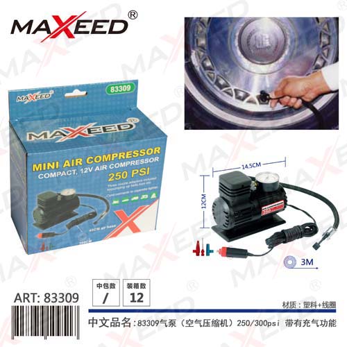 Item No:83309 Product name:83309 air pump (DC 12V 16 cylinder 250/300psi with inflation function, air flow rate of 16 liters/minute, 3-meter wire with cigarette lighter, 45CM air hose with three accessories and CE certification) Color |