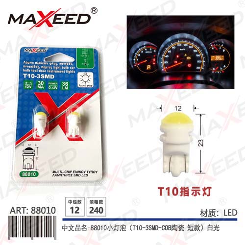 Item No:88010 Product name:88010 small light bulb (T10-3SMD-COB ceramic short version) white light 12V 2PC Color |