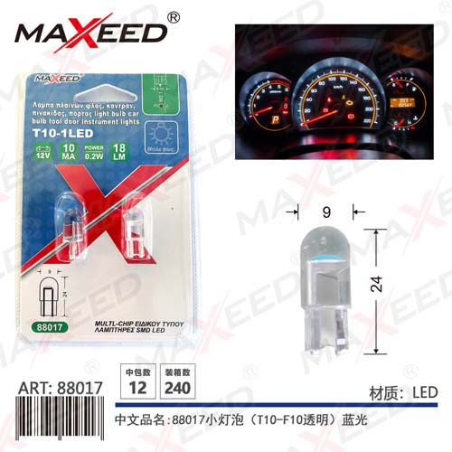 Item No:88017 Product name:88017 small light bulb (T10-F10 transparent) blue light 12V 2PC 划译 88017 small light bulb (T10-F10 transparent) blue light 12V 2PC Color |