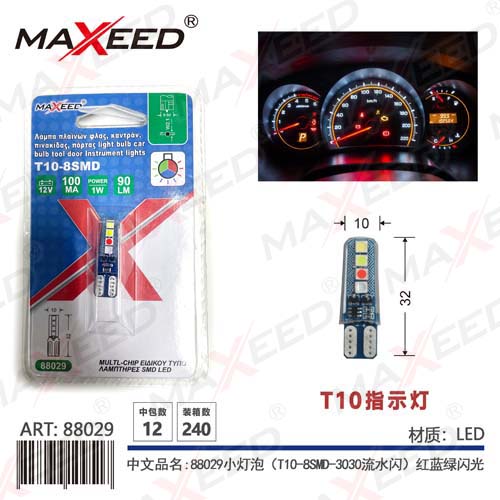 Item No:88029 Product name:88029 small light bulb (T10-8SMD-3030 flashing water) red, blue, green flashing 12V 1PC Color |