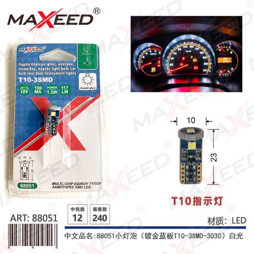 Item No:88051 Product name:88051 small light bulb (gold-plated blue plate T10-3SMD-3030) white light 12V 1PC Color |