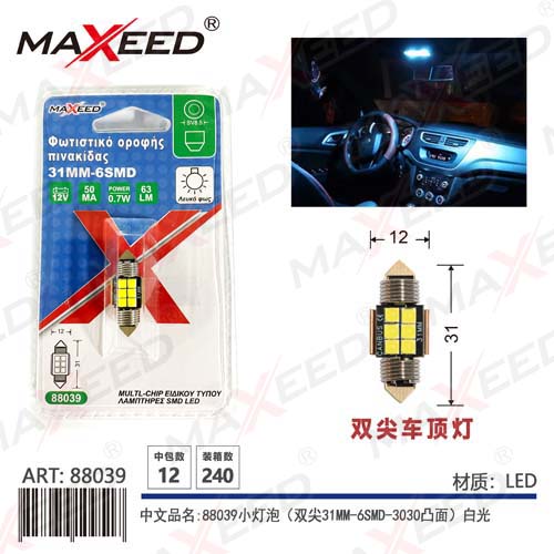 Item No:88039 Product name:88039 small bulb (double pointed 31MM-6SMD-3030 convex surface) white light 12V 1PC Color |