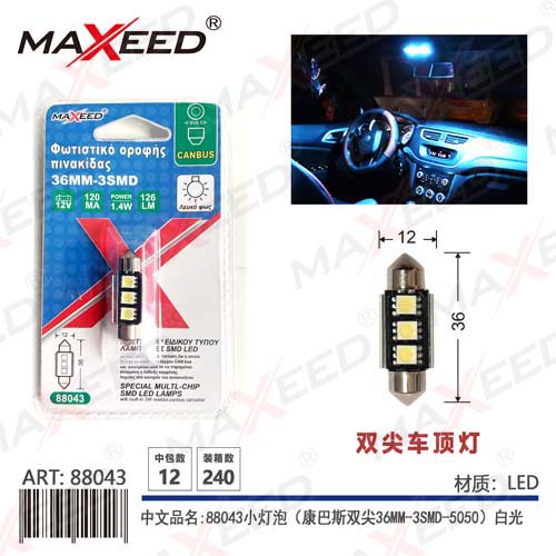 Item No:88043 Product name:88043 small bulb (Combas double pointed 36MM-3SMD-5050) white light 12V 1PC Color |