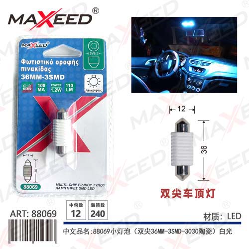 Item No:88069 Product name:88069 small bulb (double pointed 36MM-3SMD-3030 ceramic) white light 12-24V constant current 1PC Color |