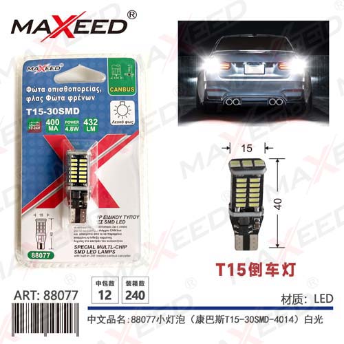 Item No:88077 Product name:88077 small light bulb (Kangba T15-30SMD-4014) white light 12-24V constant current 1PC Color |