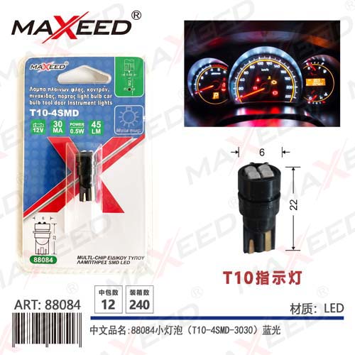 Item No:88084 Product name:88084 small light bulb (T10-4SMD-3030) blue light 12V 1PC Color |
